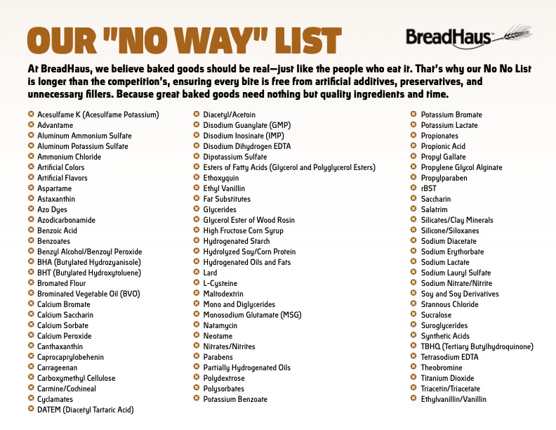 At BreadHaus, we believe in complete transparency about our ingredients. Here's our commitment to you: a comprehensive list of ingredients and additives we absolutely will NOT use in our breads and products.